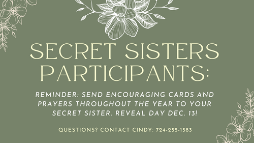 From the start of the new year through December, Women's Ministry participants can join the Secret Sisters Program. Everyone is assigned a "Secret Sister" through random drawing and then both give and receive encouraging prayers or scriptural encouragement through uplifting cards. Secret Sisters celebrates sharing the joy and love of Jesus with one another. At the end of the program we will reveal our Secret Sisters!